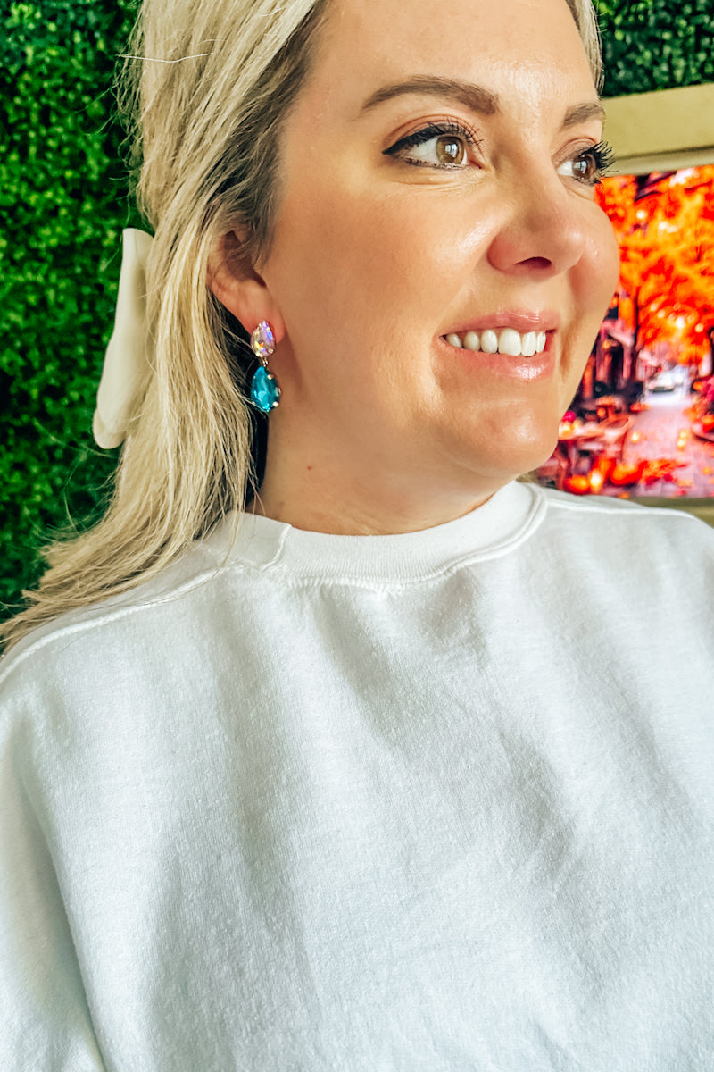 The Azure Aura Earrings feature a radiant aqua teardrop paired with a pastel prism stud, creating a dreamy, eye-catching glow from every angle.