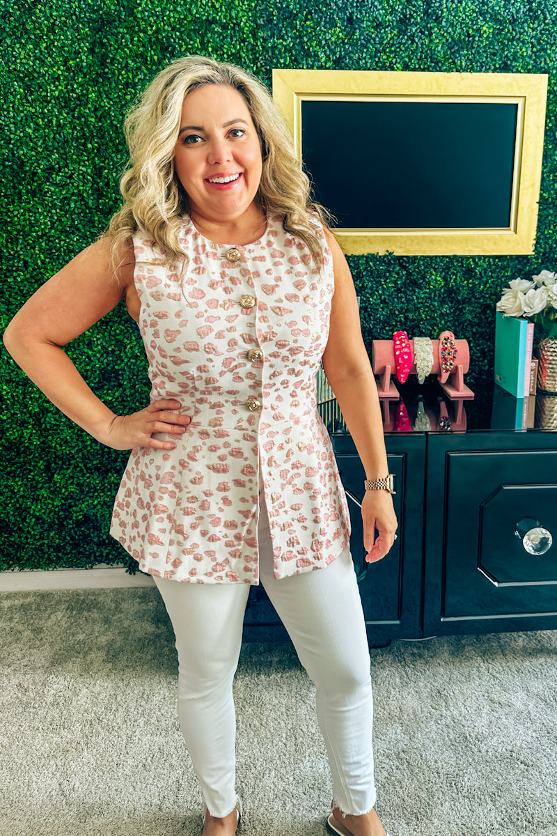 It's the trending cut you've been seeing everywhere this season...the sleeveless vest top! We love that the Bailey is classy and feminine in its silhoutte, but also sassy and fun with its subtle leopard print. The delicate pink spots are embroidered, giving this top a beautiful jacqard texture, and they pop with a barely-there gold trim that catches the light. This vest top is further elevated with gold buttons. We love the Bailey vest top paired with shorts, a neutral bag, and elegant slides for summer!