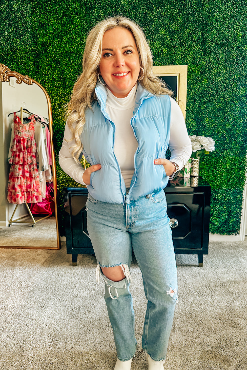 Add a subtle touch of femininity to any outfit with this puffer vest, featuring a satin organza bow in the back! We love her worn with skirts, over top of dresses, or paired with a bodysuit or long-sleeved crop top and high-waisted denim and sneakers.