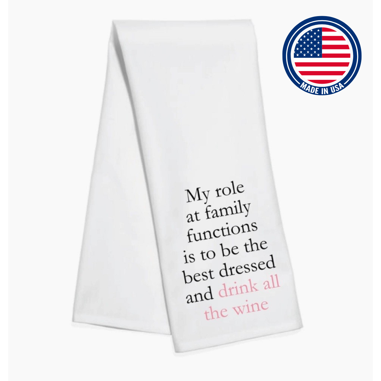 Everyone has that aunt, or that sister, or that cousin (or maybe you're her!). Celebrate your fabulousness with this sassy towel that hangs pretty in a bathroom, in a kitchen, or as part of a bar cart or a tea table. She is made from a thick, sturdy white fabric, and will definitely make a statement in your home!