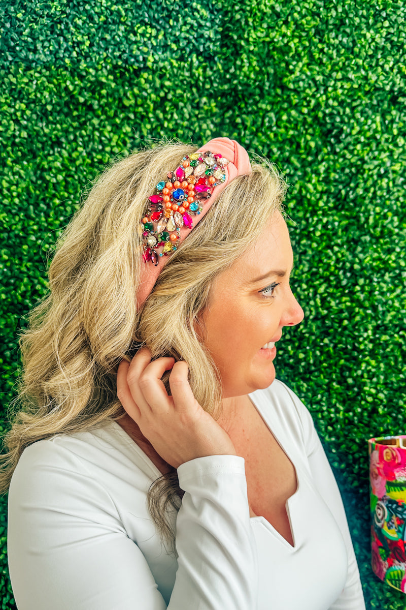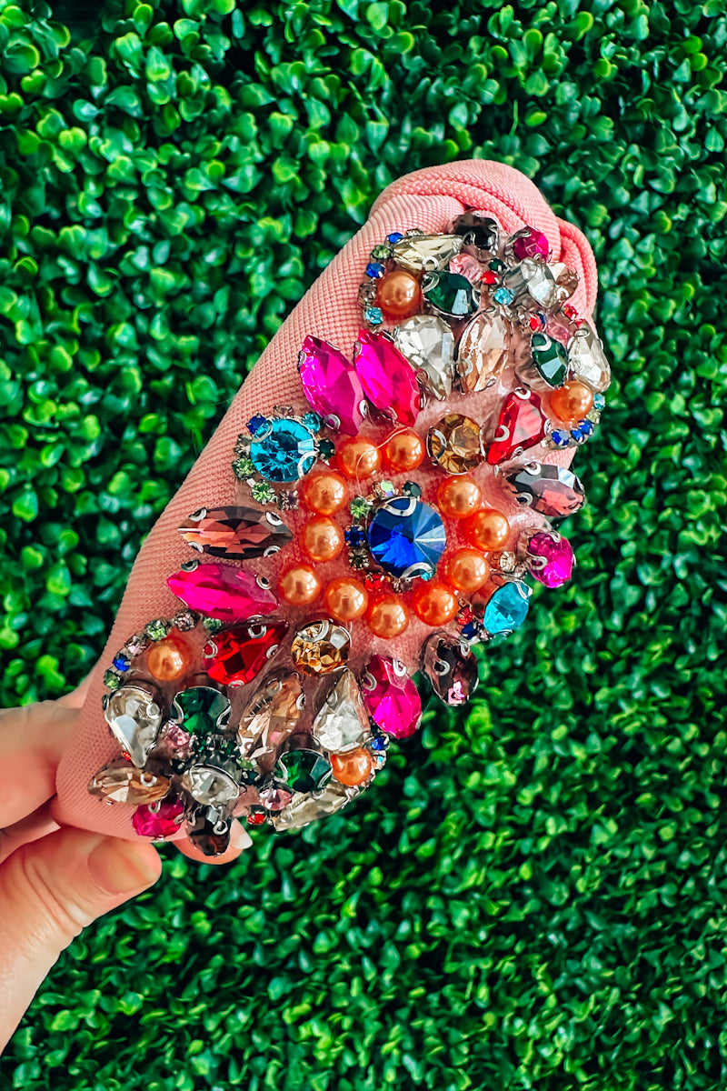 Add a touch of fun and glamour to your hair with the "Christina" Gem Light Pink Headband. This knotted headband features statement beads and sparkling rhinestones, perfect for any special occasion. Make your hair shine with this playful and stylish accessory.