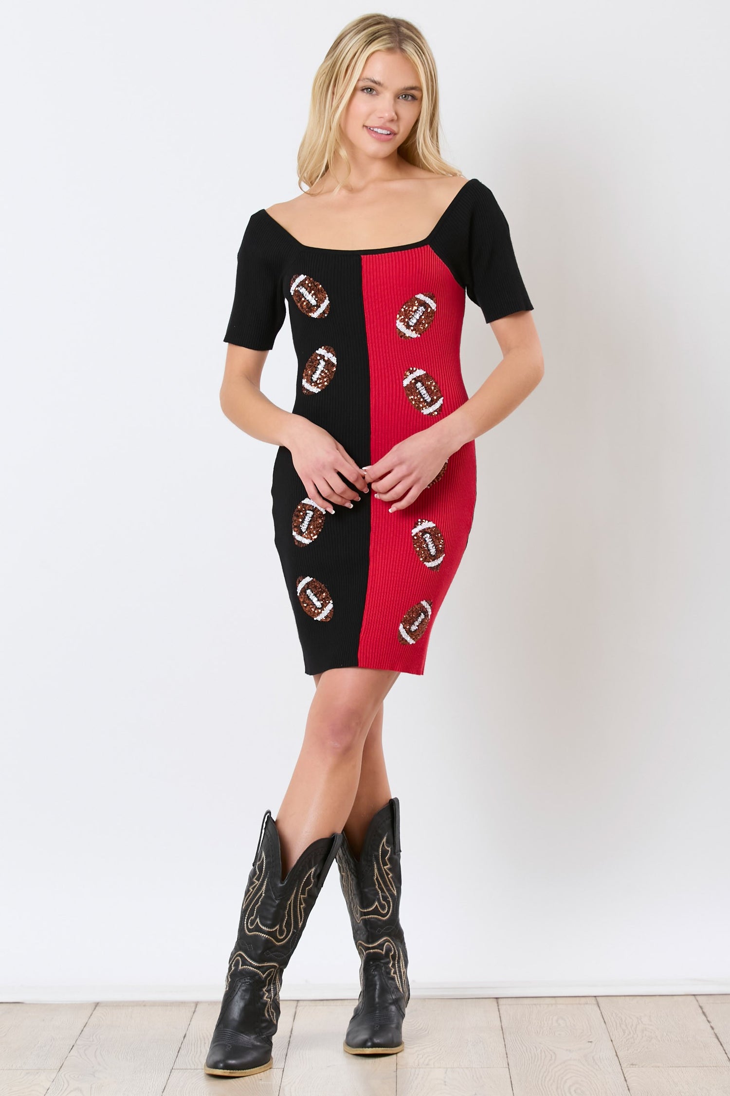 Score a style touchdown in this stunning red and black gameday dress! This dress features a statement-making football sequined pattern and a playful slightly off-the-shoulder sleeve.